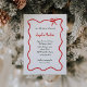Este convite de chá de fraldas chic e elegante, estilo coquete, com ponto de vista de gênero, apresenta um quadro ilustrado vermelho desenhado, ondulado, com um arco, e um roteiro branco verde-escuro e vermelho escrito à mão sobre um fundo branco para um chá de fraldas da época de Natal.