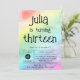 Este convite de aniversário da Tendy Rainbow apresenta um título personalizado e as suas informações num estilo de grelha à frente. Ambos os lados têm um fundo arco-íris de cor d'água. Escolha uma das opções de white paper para obter melhores resultados. Use o formulário modelo para adicionar seus detalhes. O recurso Personalizar permite alterar o estilo da fonte e adicionar ou excluir texto.