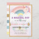 "Um dia mágico está a caminho" O convite de aniversário da rapariga apresenta um fundo cor-de-arco-íris com um unicórnio, arco-íris, coludes e falsos gotas de ouro. O verso apresenta um fundo branco com faixas coloridas do arco-íris. Personalize para suas necessidades. Você pode encontrar mais produtos correspondentes na minha loja.