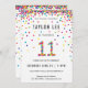 Arco-Íris, aniversário de 11 anos / convites de aniversário de 11! Apresentando os detalhes da festa do seu menino ou menina de 11 anos e um "11" em confetti, com círculos confetários coloridos e divertidos borrifados do topo desses convites bonitinhos