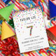 Arco-Íris de 7 anos / convites de aniversário de 7! Apresentando os detalhes da festa do seu menino ou menina de 7 anos e um "7" em confetti, com círculos confetais coloridos e divertidos borrifados do topo desses convites bonitinhos