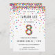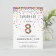 Arco-íris de 8 anos / 8º convites de aniversário! Apresentando os detalhes da festa do seu menino ou menina de 8 anos e um "8" em confetti, com círculos confetais coloridos e divertidos borrifados do topo desses convites bonitinhos