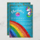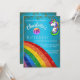 Um convite de aniversário de unicórnio azul brilhante personalizado com um lindo e gigante arco-íris brilhando no fundo, tudo sobre um fundo azul claro. Há um pequeno e bonito unicórnio colorido no canto superior direito, e um quadro brilhante dourado ao redor das bordas. Todos os detalhes podem, naturalmente, ser personalizados, clicando no botão 'Personalizar esta modelo' acima. O contrário também é azul, e tem o mesmo unicórnio na frente, apenas uma versão muito maior. Este anúncio colorido e bonito do partido unicórnio fará com que qualquer festa de menina comece a excelente! 🦄