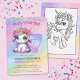 Torne o seu 7 de aniversário extra mágico com este convite malvado do arco-íris unicórnio. Apresentando um unicórnio pastel chibi com uma coroa de flores e sotaques espumantes, é a maneira perfeita de dar o tom para uma celebração divertida e colorida. Um grande arco-íris "7" faz o design pop, e o verso inclui uma página de cores de unicórnio bida.
