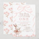 Arco Branca Rosa Alguns Aniversário Coelhinhos Convidam Meninas Doces coelhando o convite de aniversário que pode ser usado em qualquer idade com um arco rosa, coração e coelhinho fofo em um tutu. Este convite de aniversário coelho também apresenta margaridas cor-de-rosa e marrom.