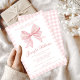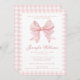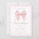 Adorável convite de chá de "Fraldas e toalhetes", tema de menina, apresentando uma ilustração encantadora cor-de-água rosa de um arco rosa giro cercado em um padrão de gingham bonito. Ideal para o chá da menina pré-disquete e na moda coquete.
