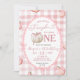 Arco Rosa Gingham Pumpkin primeiro aniversario Invitation, Our Pumpkin Está Virando Um Aniversário Convidado, Crianças Editáveis Primeiro Aniversário