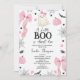 Arco rosa moderno Pequeno Boo Quase Devido Convite para Chá de fraldas Convite para o chá de fraldas do Dia das Bruxas de uma menina doce, com alguns fantasmas, abóboras, morcegos, arcos rosa, folhagem e teias de aranha. Este pequeno boo está quase na expectativa de que o chá de fraldas seja ideal para um chá de fraldas de outubro para uma menina.