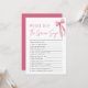 Descubra percepções hilárias com o nosso jogo de Chá de panela "O que o noivo disse". Com seu charmoso design cor-de-rosa, este jogo adiciona um toque de elegância à sua celebração enquanto os convidados adivinham as respostas do noivo a várias questões sobre a futura noiva. De sentimental a bobo, este jogo certamente despertará risos e criará memórias inesquecíveis enquanto os convidados tentam corresponder às respostas do noivo.