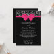 Este convite formal de casamento apresenta um elegante padrão de rosa preto e branco, um arco rosa quente e um texto branco sobre fundo preto.