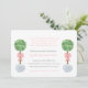 Bola topiária pintada à mão em uma plantação de jarros de gengibre enfeitada com arco rosa de disquete para este design de convite para chá de fraldas clássico.