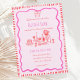 Este convite de casamento ilustrado com estilo desenhado à mão apresenta um laço rabiscado e elementos de mesa de jantar. O design caprichoso e excêntrico inclui fonte manuscrita e rabiscos de celebração. Cores rosa e vermelha para papelaria de casamento clássica e moderna.