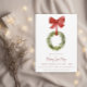 Um arco vermelho pendurado no natal, dia feriado, convite para casa aberta. Este convite de festas de natal apresenta uma coroa verde de natal com um arco vermelho. Todo texto pode ser personalizado com qualquer texto de sua escolha.