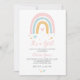 Convite para chá de fraldas de menina com arco-íris e corações em cores pastéis.