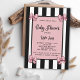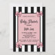 Convide os convidados a comemorar o seu pequeno estilo com este convite para Chá de fraldas chic! A frente apresenta um fundo riscado preto-e-branco ousado, criando um olhar moderno e elegante. No centro, os detalhes do convite são exibidos em um retângulo com um fundo rosa suave, delimitado por um quadro preto elegante. Cada canto do retângulo é enfeitado com delicados arcos cor-de-rosa que correspondem perfeitamente ao gráfico principal, adicionando um toque doce e feminino. Perfeito para um chá de fraldas sofisticado, mas brincalhão, este convite combina elegância clássica com um pop de cor e charme!