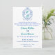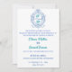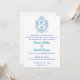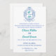 Este convite para o casamento mostra um elegante design de arte de linha azul com um quadro oval ornamentado adornado com motivos florais, fitas e arcos. Os detalhes intrincados criam um olhar vintage e refinado sobre um fundo branco, perfeito para um tema de casamento tradicional ou formal.