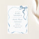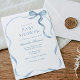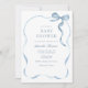Convite para chá de fraldas com um arco e fita azul-aquarela. Personalize com suas informações ou clique em "Clique para personalizar mais" para editar estilos de fonte, tamanho e cores.