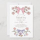 Cartão de convite de aniversário de menina bonito com ilustração de arcos e flores em cores rosa e roxo.