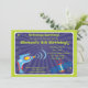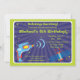 Este convite de aniversário do divertimento caracteriza uma estação espacial e uma arma de raio grande em um fundo azul do espaço com estrelas. Completamente customizável.