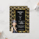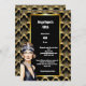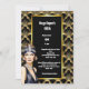 Celebre seu aniversário de marco com este maravilhoso convite do tema "O Excelente Gatsby" de 5x7 polegadas. Esta vibrante, moda e design de safra apresenta uma linda e atraente batedeira cabeleira caucasiana, vestindo uma faixa de cabeceira, pérolas e um topo sem fio, em pé contra um padrão de borda de escalão de ouro falso, deco, que molda uma camada preta na qual modelos de texto brancos aparecem para sua redação personalizada. Este elegante, luxuoso, retrô e antigo design da era é ideal para qualquer celebração especial de 1920.