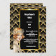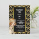 Celebre seu aniversário de marco com este maravilhoso convite do tema "O Excelente Gatsby" de 5x7 polegadas. Esta vibrante, moda e design de safra apresenta uma linda e atraente flaper caucasiana vermelha de cabelos vermelhos que veste uma faixa de cabeceira, pérolas e um topo sem fio, em pé contra um padrão de borda de escalpo dourado falso de deco que enquadra uma camada preta na qual modelos de texto brancos aparecem para sua redação personalizada. Este elegante, luxuoso, retrô e antigo design da era é ideal para qualquer celebração especial de 1920.