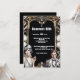 Celebre seu aniversário de marco com este maravilhoso convite do tema "O Excelente Gatsby" de 5x7 polegadas. Esta vibrante, moda e design de safra apresenta uma bela mulher solteira caucasiana e um homem de pé contra uma borda inspirada em arte cheia de gemas brancas, linhas geométricas douradas e elementos decorativos simétricos A borda enquadra uma camada preta na qual modelos de texto branco aparecem para sua redação personalizada. Ele está vestindo um terno formal de cinza leve e gravata de arco e ela está vestindo um falso chapéu prateado e fora do vestido do ombro. o dorso tem um modelo adicional para mais detalhes, se necessário. Caso contrário, basta suprimir o texto no verso. Esta elegante, luxuosa e antiquada design é ideal para qualquer celebração especial de 1920.
