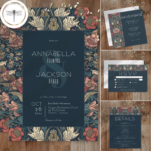Convites Art Nouveau Blue William Morris Floral Wedding