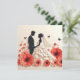 Lindo ilustração de um casal de roupa de casamento com um fundo de papoilas vermelhas e borboletas negras. O casal está em silhueta, com o noivo em terno e a noiva em um vestido fluido com um véu. O esquema de cores é vermelho, preto e branco.