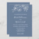 Design minimalista com o esboço floral branco de cereja floral floral floresce e sobre um fundo azul empoeirado. Um convite de casamento feito por uma mão botânica moderna, com noiva e nomes de noivas em um roteiro elegante escrito à mão.