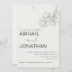 O convite para o casamento apresenta uma disposição minimalista e personalizada com uma estética limpa, moderna e elegante sobre um fundo de marfim ligeiramente texturizado. Possui um gráfico floral de arte de linha e o design é centrado, com nomes em negrito e maiúsculo como ponto focal, separado por um delicado conector cursivo. O texto é organizado em uma hierarquia estruturada, com os detalhes introdutórios posicionados no topo em uma fonte menor e subestimada. Abaixo dos nomes, os detalhes do evento — incluindo data, hora e local — são formatados de forma clara em um tipo refinado e fácil de ler. A seção inferior fornece informações adicionais sobre a recepção, mantendo a mesma simplicidade e sofisticação que o resto do convite. A apresentação geral é moderna e desajeitada, enfatizando clareza e elegância. Há florais de arte de linha na frente e atrás