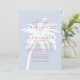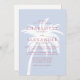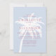 Um convite de casamento costeiro na moda com uma silhueta de palmeira branca e arrojada contra um fundo azul macio com tipografia rosa moderna. Perfeito para a praia, náutica ou casamentos de destino, essa design combina uma vibe relaxada à beira-mar com elegância contemporânea. Ideal para casais que buscam uma estética cômica, inspirada em Hamptons ou tropical costeira.