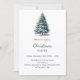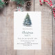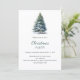 Um convite de inverno para uma festa de Natal. Um fundo branco na frente decorado com um pinheiro desenhado à mão, de cor aquosa, com neve. Personalize e adicione os detalhes da sua festa. Fundo: fundo azul-verde.