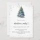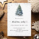 Um convite de inverno para uma festa de Natal. Um fundo branco na frente, decorado com um pinheiro desenhado à mão, de cor aquosa, com neve e brilho falso. Personalize e adicione os detalhes da sua festa. Fundo: fundo azul-verde.