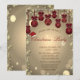Um convite elegante para festas de Natal com bolas de Natal vermelhas com chapéu de Papai Noel em um fundo de creme. Estes belos convites de Natal são perfeitos para convites de festas de janto de Natal, convites para troca de presentes de Natal, angariadores de fundos de Natal, convites para bolas de férias e outros eventos realizados durante o mês de dezembro. Use apenas os campos modelo para adicionar suas próprias informações de evento.
