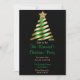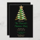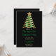 Uma árvore de natal verde e dourada sobre fundo preto. A parte de trás do convite é preto com padrão de neve