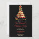 Um convite à árvore de natal vermelha e dourada num fundo preto. A parte de trás do convite é preto com padrão de neve