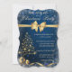 Um convite elegante para festas de férias com uma árvore de natal dourada e arco em fundo azul. Estes belos convites de Natal são perfeitos para convites de festas de janto de Natal, convites para troca de presentes de Natal, angariadores de fundos de Natal, convites para bolas de férias e outros eventos realizados durante o mês de dezembro. Use apenas os campos modelo para adicionar suas próprias informações de evento.