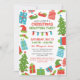 Convide seus amigos e parentes para uma festa de embrulho de Natal, com este charmoso convite com símbolos de Natal em vermelho, verde e azul num estilo ilustrativo charmoso inspirado pelo estilo retro caprichoso da 50 com árvores de Natal, presentes envoltos, calçados de elfo e chapéus de elfo, e Holly. Ofereça convite de festas de embrulho com ilustrações divertidas em um estilo retrô maravilhoso em vermelho, azul e verde.