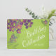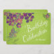 Com o olhar do linho verde este convite customizável bonito do aniversário é certo ser uma batida com qualquer um que ama flores bonito! Flores roxas das características em um fundo de linho verde do olhar na parte dianteira e na parte traseira com texto que lêem a celebração do aniversário na parte dianteira e as áreas que são fáceis de personalizar com a toda sua informação da festa de aniversário.