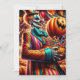 Convites de Halloween personalizados. Vintage assustou palhaço no carnaval retrô segurando uma lanterna jack o' e uma tigela de doces cercada por balões de Halloween.