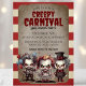 Este convite de festa personalizado assustador do Dia das Bruxas apresenta um tema assustador de carnaval. Três palhaços assustadores estão impressos no fundo. Um poster de carnaval de papel de pergaminho de estilo vintage é apresentado em segundo plano, sobre um padrão listrado vermelho e branco.