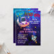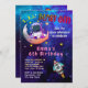 Rapariga Astronauta e Festa de aniversário da Lua Convidam mostra texto dizendo, 3,2,1— Explosão! Tem um astronauta personalizável posando com uma lua crescente. Em seguida, há um lugar para colocar o nome da criança. Uma nave de foguete se acelera no fundo. Tudo contra um céu estrelado. O verso do convite tem muitas ilustrações espaciais legal.