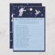 Ter uma saída deste chá de fraldas mundial para um bebê? Experimente uma aventura no espaço externo com este jogo de melhor chá de fraldas do Quem conhece o Pai! Fundo azul escuro com estrelas da meia-noite azuis, um pequeno homem espacial, lua amarela cheio e nave espacial! Modelos criaram por você.
