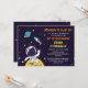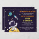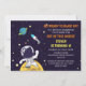 Convite de aniversário com fundo azul escuro com estrelas amarelas no fundo. Camada sobre o topo é uma lua amarela e um homem-espaço acenando. Atrás dele está um planeta com anéis e um foguete voando para o espaço.