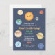 Um convite de aniversário colorido e bonito do espaço com ilustrações bonitas do sol e planetas do sistema solar - Mercúrio, Vênus, Terra, Marte, Júpiter, Saturno, Urano e Netuno. Será uma festa de aniversário astronômica! Personalize facilmente com os detalhes do seu partido.