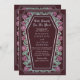 Faça uma declaração ousada de amor eterno. Este convite de casamento gótico apresenta "Até a morte nos separe" em um quadro em forma de caixão, enfeitado com espinhos, rosas e sotaques prateados contra um fundo vermelho rico. Perfeito para uma comemoração romântica assombrosa! Personalize o texto, a fonte e a cor de fundo para se adequar às suas preferências de design. Correspondência de Itens em nosso compro para um tema completo de festa. Note que a prata do convite NÃO é uma folha real e é impressa em cores planas.