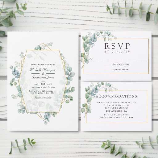 Floresta de eucalipto verde adiou o anúncio de casamento com o quadro geométrico dourado personalizável para suas especificidades de evento.