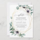 Anúncio de casamento adiado com eucalipto geométrico verde e flores de papoila em tons pastéis com moldura geométrica dourada e lavagem com aquarela da casa da moeda inversa.
