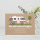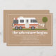 Aventura, chá de fraldas de menino temático com ilustração de trailer de camper retrô azul e branco com roupas de bebê penduradas na linha de roupas conectadas a cada árvore verde. O plano de fundo é o estoque de cartão marrom inspirado.