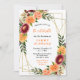 This fun and whimsical birthday party invitation features watercolor burgundy red and orange flowers with foliage on a gold geometric frame. The text combines handwritten script and serif fonts for a stylish and modern look. This is perfect for an autumn fall rustic birthday party.